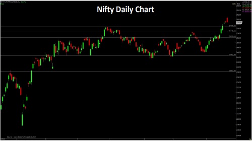 Nifty opened on a positive note and extended buying momentum in the first half however selling in the second half led the index lower to close near day's low. Nifty closed at 25891 with a gain of 23 points. On the daily chart index has formed a sizable bearish candle indicating negative bias. The chart pattern suggests that if Nifty crosses and sustains above 26000 level it would witness buying which would lead the index towards 26100-26200 levels. Important Supports for the day is around 25860 However if index sustains below 25860 the nit may witness profit booking which would take the index towards 25800-25700 levels.
