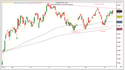 * Technically, the Nifty looks poised to retest the trendline hurdle near 25,450, and a decisive breakout above this level could propel the index toward 25,650 and beyond.