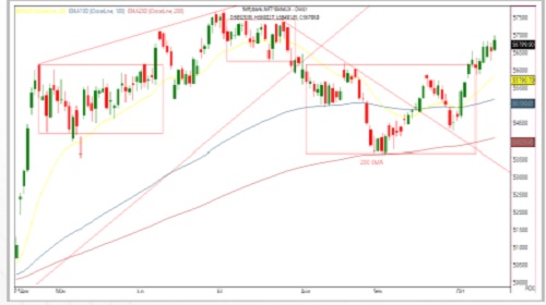 * Key resistance is observed near 57,600, with support around 56,000.