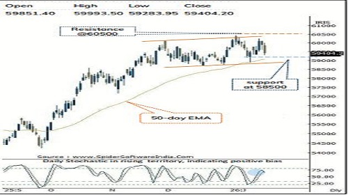 * Key point to highlight is that Index is witnessing profit booking post 1400 points rally in last week. On a broader perspective Index continues to trade within rising channel, while holding firm above its 50-day EMA, indicating broader structure is intact. Going ahead, we believe follow through action above previous week high (60,235) will challenge higher band of consolidation at 60500. failure to do so will led to a consolidation in the 58,900-60200 range. Key support for index is placed at 58500 being former resistance now turning as support as per change of polarity principal.