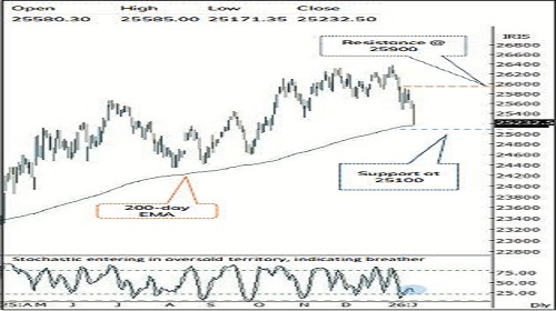 * Key point to highlight is that following a ~1200-point decline, index has approached towards its 200-day EMA (25,100) which has been held since April 2025. With this sharp decline stochastic oscillator is entering into oversold zone, signifies temporary pause in downward movement cannot be ruled out. However, a close above the previous session’s high is essential to arrest the decline and trigger a meaningful pullback. Failing this, the index is likely to consolidate with stock-specific action.