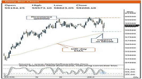 * Key point to highlight is that Index has formed higher highlow pattern after healthy profit-booking in the past three session, indicating pause in downward momentum. Going ahead, we believe follow through action above previous session high could open the path for technical pullback towards 60000, failure to do so will led to a consolidation in the 58,100-60000 range. Key support for index is placed at 58100 being 100-day EMA