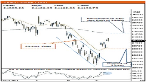 * On a broader perspective, index has confirmed conclusion of corrective phase by fulfilling prerequisites like close above its last week’s high, sustenance above short-term moving average. In addition to that, faster pace of retracement (as 13 sessions decline entirely retraced back in just 4 sessions), highlights structural turnaround. Hence, formation of higher base amid ongoing consolidation would set the stage for heading towards 24800 in coming weeks