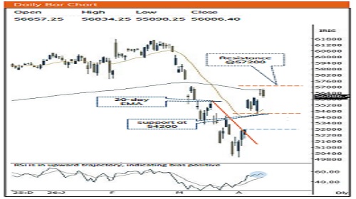 * Key point to highlight is that Index has been consolidating above its short term 20-day EMA and decisively closed above its phycological mark of 56000 which has been acting as a hurdle from past three session, indicating resumption of the current upmove. Going ahead a decisive close above 200-day EMA will open the door for the next leg of up move towards 57200 in the coming weeks. Hence, any decline from current levels should be used as buy on dips strategy as strong support is placed at 54200, as it is confluence of Gaparea (52800-54800) and 38.2% retracement of March-April decline (56786-49954). Wherein focus should be on accumulating quality stock backed by strong Q4 earning.