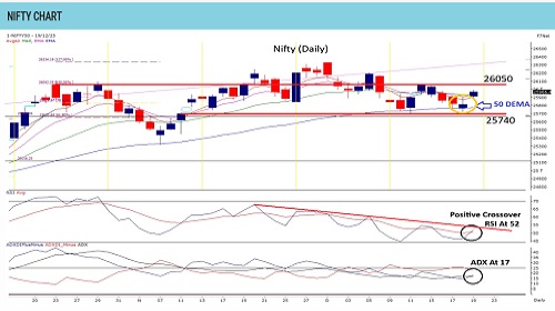 Last week’s rebound from the 50-DEMA support at 25740, coupled with the formation of an Inverse Hammer candlestick, may signal an early indication of a potential trend reversal. The daily RSI has registered a positive crossover above the 50 mark, further reaffirming the gradual improvement in momentum. This recent price action, with key indicators positioned near the upper boundary of the prevailing range, raises the possibility of a longawaited range breakout. However, a sustained follow-through above 26050 remains essential to re-establish bullish trend strength. Until this resistance is decisively breached, the broader structure is likely to witness minor pullbacks within the established 25740–26050 range. Momentum indicators continue to send mixed signals. While RSI has turned positive, ADX has eased to 17, well below its 25 thresholds, indicating a lack of strong directional conviction. A convincing breakout above 26050 could significantly improve sentiment and open the pathway toward 26330. Conversely, a breakdown below 25740 would weaken the setup and may expose the index to further downside. Given the current configuration, traders are advised to remain cautious and consider adding aggressive fresh positions only if directional strength improves above the key resistance of 26050, preferably early in the week.