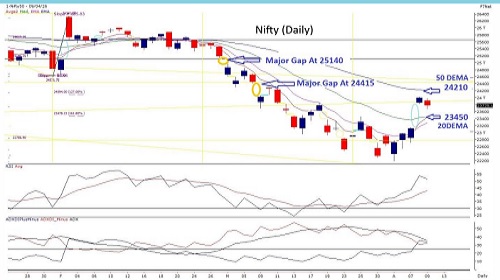 The Nifty witnessed profit booking pressure near the 24000 mark, slipping below its previous day’s swing low and closing beneath it, indicating near-term weakness. The immediate resistance is now placed at 24225 (50 DEMA), followed by a key gap resistance around 24415. This zone may be difficult to surpass unless crude oil prices soften below the $88 level on a sustained basis. A decisive close above the 24000 CE OI cluster would signal potential for renewed short-covering, which could push the index towards the 24200 zone. On the downside, the 20 DEMA at 23450 is expected to act as immediate support. However, macroeconomic factors continue to weigh on sentiment. Elevated USD/INR levels, firm crude prices above $90, persistent FII outflows, and ongoing geopolitical tensions may keep any pullbacks vulnerable. Traders are advised to remain cautious in the 24230–24420 zone, consider profit booking at higher levels, and look for re-entry opportunities on dips. The broader structure remains constructive as long as the index sustains above 22630 during the current series.