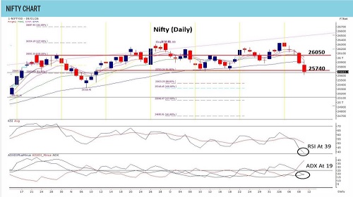 Nifty has slipped decisively below its 50 DEMA support at 25900 and extended the decline toward its make-or-break zone of 25,700. This breakdown is accompanied by a negative crossover in short-term averages, indicating scope for further weakness. The 25900–26050 band has now turned into a stiff resistance area, while the next support is seen in the 25550– 25430 zone. The options band also reflects a lower shift, now placed between 25950 and 25500 for the week. The market texture has turned neutral from positive, and only a close above 26130 would signal a revival in trend strength. Traders may consider fresh long positions only above 26130. Until then, a long–short strategy is advisable as the index oscillates within the 26050–25430 range