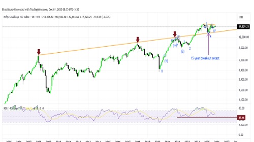 We released a report on Nifty titled Abhi Nahi Toh Kabhi Nahi on 03rd March 2025 with a recommendation to buy at 21800-22000 levels for a target price of 27000 in 9-12 months. The index has moved in line with expectations and made a fresh life high levels of 26300 and is poised to reach 27000 levels in the coming time. During this period, the large cap stocks have not only witnessed strong gains but also exhibited marked outperformance. We have released multiple reports on the large cap stocks to tap on the potential which have given good gains, however, the smallcap space has been under intense pressure with majority of stocks witnessing deep corrections in the last few months. Our expectations are this underperformance in smallcap index is likely to end and an upside of 20-25 percent can be achieved by December 2026, thus providing wonderful investment opportunities for the long term. Chart 1 shows the long-term structure of Nifty Smallcap100 index. Please note that the overall strength remains same in other smallcap indices, however, Smallcap100 is chosen due to its long price history. The index witnessed a 15- year ascending trendline breakout in 2023 which resulted in a significant upside. The index witnessed a strong price correction in March this year and since then it has been undergoing time correction. Interestingly, the index bounced back sharply after retesting the multiyear breakout implying the worst seems over and it can pick up strong momentum in coming months. RSI has also bounced from strong support zone with early signs of hidden bullish divergence which supports the postulate of a strong upside