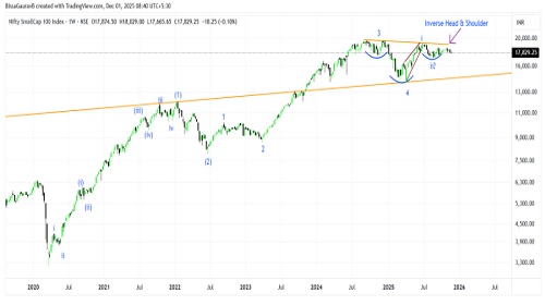 Chart 2 shows Nifty Smallcap100 index in a relatively short time period to understand the internal structure. The index seems to have completed a small wave ii implying it can cross previous life high to complete wave iii. It can move 20-25 percent from current levels to complete the larger wave 5. The index is also forming an inverse head and shoulder pattern with breakout confirmation on close above 19200 levels. The pattern target syncs with the Elliot wave target of 21300-22200 levels