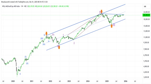 Chart 3 shows the chart of Nifty Midsmallcap400 index to understand the overall sentiment of the broader market. The index is trading in an ascending channel pattern since 2022 and is currently on the verge of a consolidation breakout, which once confirmed can result in a strong upside. The index seems to have completed a smaller wave [2] pattern which supports the overall expectations of 20-25 percent upside in a year.