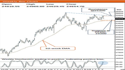 * Nifty is likely to open Gap-up tracking positive global cues. We believe, the last weeks profit booking is more of retracement of past three weeks >1000 points up move. In the upcoming truncated week, we expect Nifty to consolidate amid stock specific action wherein strong support is placed in the range of 24400-24200 zone. Meanwhile, on the upside immediate resistance is placed at 25300.
