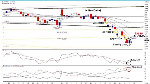 Nifty commenced the week on a relatively stable note, managing to hold on to its pullback and closing the session in the green above the 23,400 mark. During the early part of the session, the index slipped below 23000, forming a swing low near 22955. However, the formation of a Piercing Line candlestick pattern near the close has brought some optimism for a potential short-term pullback, initially towards its 5-DEMA zone near 23630. Despite this recovery, last week’s recurring lower-gap formations on the daily chart continue to highlight the fragile nature of the market, largely influenced by ongoing geopolitical tensions. From a technical indicator perspective, the trend strength indicators remain divergent. The ADX continues to scale higher, suggesting that the prevailing trend still holds strength, while the RSI is rebounding from its oversold zone without displaying any positive divergence. This combination points toward a fragile pullback within an overall weak market structure rather than a confirmed trend reversal. The immediate gap resistance zone of 23556–23630 is likely to act as a short-term pullback hurdle, particularly since the index is currently trading significantly below its 5-DEMA, placed near 23630. For the week, the major resistance is seen around 23830. On the downside, the index could find temporary support near 22920, where an unfilled gap from the previous up-move still exists. Given that the broader trend remains under pressure, traders are advised to avoid aggressive long positions and instead adopt a range-trading strategy until a clear reversal in price action and market sentiment emerges. Initiating fresh positional trades without confirmation should be avoided. It is also prudent to maintain adequate hedges on existing long positions and keep position sizes smaller, considering the heightened volatility driven by geopolitical developments and fluctuations in crude oil prices.