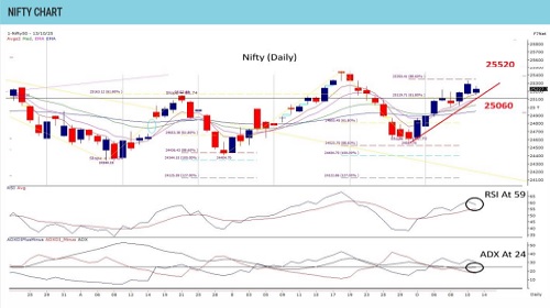 Nifty sustained its bullish momentum last week, consistently holding above the 5-DEMA support despite brief intraday dips. After a soft start this week, the index recovered to close back in positive territory above its 5-DEMA level of 25165, showing continued strength. The breakout above 25200 was backed by higher volumes and firm trend indicators. The ADX, now near the key 25 zone, signals strengthening momentum — a sustained move above this could open the path towards 25500. In derivatives, the options base has shifted higher from 24500 to 25000, with resistance at 25500 and a congestion zone near 26000. Overall, a close above 25170 would confirm a follow-through breakout, reinforcing the medium-term uptrend. The strategy remains buy-on-dips above 24940, aiming for 25400–25500 in the coming weeks.