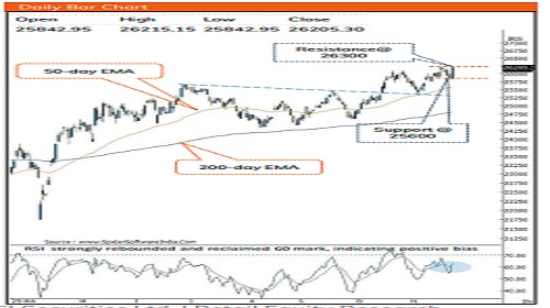 * Key point to note is that the index has witnessed a faster pace of recovery, retracing the entire three-day decline in a single session, strengthening bullish momentum. Strong buying interest in heavyweight large-cap stocks propelled the index to stage a sharp rebound in last session, closing just 70 points away of its all-time high. With market leadership clearly rotating back toward major heavyweights, we expect the index to decisively challenge its record peak and ultimately resolve higher toward a revised target of 26,800 in coming month.
