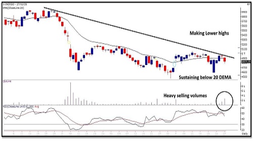 • Formed a strong bodied bearish candle and is trading below 100 DEMA.