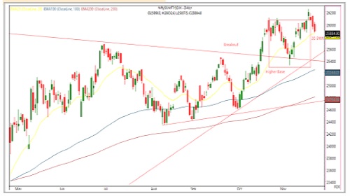 * The Nifty is once again approaching its short-term support at the 20-DEMA, near 25,800, which will be crucial to defend for momentum to sustain.