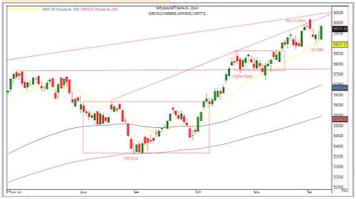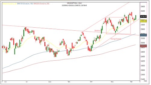 * Technically, Nifty has bounced from the crucial support zone defined by the 20-DEMA, which also aligns with the trendline support of the rising channel on the daily chart around the 25,900–26,000 area.