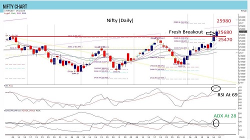 Fresh breakout momentum was evident in the previous session as the Nifty50 surged past the 25500 zone and closed firmly above the 25700 resistance, confirming a strong price breakout. This decisive close signals renewed conviction for a potential move towards the 26000 zone. Both trend strength indicators continue to trend higher, with the ADX now above 25, indicating improving directional momentum. A sustained move above 25700, especially on rising volumes, could further trigger short covering and open the path towards the 26000–26500 range. On the derivatives front, the options base has shifted higher from 25000 to 25500, suggesting stronger support, while resistance is seen around 26000, a major congestion zone. A close above 25170 has reaffirmed the bullish momentum, and the follow-through breakout above 25500 strengthens the medium-term uptrend. Strategy is to continue to buy on dips, with a momentumbased stop loss below 25470, and targets at 26000–26500 in the near term
