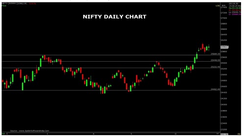 Nifty50 opened on a negative note and remained very volatile on both sides during the session. Last hour buying momentumledit tocloseonflat note . Nifty closed at 25963 with a loss of 3 points. On the daily chart the index has formed a "Doji" candlestick formationindicatingindecisiveness amongst market participants regarding the direction. The chart pattern suggests that if Nifty crosses and sustains above26006level it would witness buying which would lead the index towards 26100-26200 levels. Important Supports for the day is around 25820Howeverif index sustains below 25820 then it may witness profit booking which would take the index towards 25670-25600 levels.
