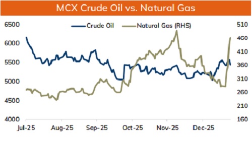 * NYMEX Crude oil may slip towards $58.50 level as long as it trades below $60.50 level. On MCX Crude oil Feb is likely to slip towards Rs 5350-Rs 5300 level as long as it stays below Rs 5600 level.