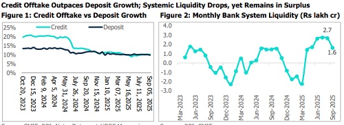 * As per CareEdge Economics, as of the end of September 2025, the RBI continued to maintain surplus liquidity conditions in the banking system, with the average surplus remaining at around Rs 1.6 lakh crore. For the sixth consecutive month, systemic liquidity stayed in surplus. The liquidity surplus has narrowed in recent weeks due to tax outflows. Some of the surplus liquidity could also be offset by the unwinding of the RBI’s short forward book. However, the RBI is undertaking variable rate repo operations to support the liquidity conditions. Additionally, the CRR cuts that began this month, along with the maturity of government securities, are expected to provide some liquidity support. Surplus liquidity conditions would continue to ensure smoother transmission of the policy rates