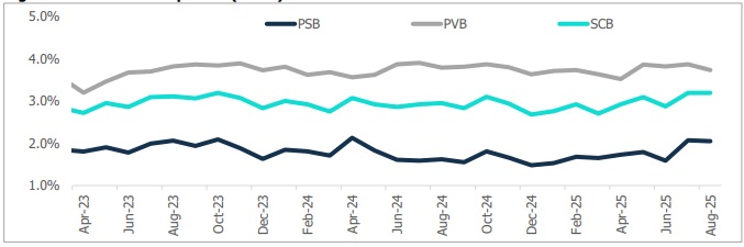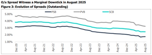 * In August 2025, fresh spreads remained flat m-o-m, with SCBs standing at 3.19%, PVBs reducing by 14 bps to 3.73%, and PSBs marginally by two bps to 2.05%. The sharper drop in PVBs’ spreads was driven by their larger proportion of books linked to the EBLR. Additionally, fresh spreads are higher than outstanding spreads.