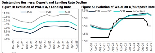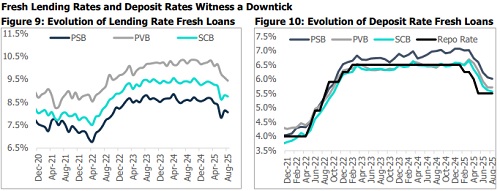 * The lending rate on fresh loans for SCBs decreased by five bps m-o-m, to 8.75%. PSBs and PVBs saw a decline of seven and 14 bps, standing at 8.06% and 9.44% respectively, as of August 2025, attributed to competitive pressures and weaker loan demand. Additionally, fresh deposit rates for SCBs decreased by 14 bps m-o-m, reaching 5.61%. PSBs and PVBs saw a decrease of 17 and 21 bps, respectively, standing at 6.06% and 5.71% as of July 2025, attributed to banks cutting deposit rates to manage funding costs and protect their margins.