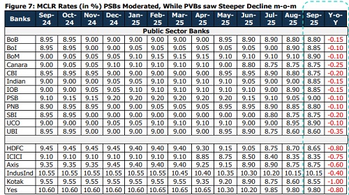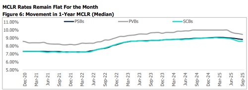 * In September 2025, the one-year median MCLR remained flat m-o-m to 8.60%. Furthermore, the MCLR of PSBs declined by five bps to 8.83%. In comparison, PVBs experienced a larger reduction than PSBs, declining by 10 bps to 9.45%. Meanwhile, FBs marginally increased by two bps to 7.05%, indicating transmission catchup among PVBs during the month.