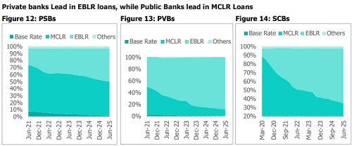 The share of External Benchmark Lending Rate (EBLR)- linked loans in total outstanding floating-rate rupee loans of SCBs increased and stood at 61.6% in June 2025 (compared to 57.5% in June 2024), while that of MCLR-linked loans stood at 33.8% in June 2025 (compared to 38.6% in June 2024). EBLR includes both repo-linked and treasury bill loans. Furthermore, compared to PSBs, PVBs have a higher share of EBLR (EBLR share as of Dec-24: PVBs, 85.9%; PSBs, 44.6%). Hence, the transmission of lending rates is faster in PVBs than PSBs.