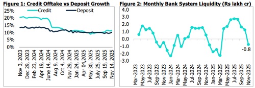 * As per CareEdge Economics, as of the end of November 2025, the RBI witnessed a deficit after remaining surplus for six consecutive months, with the average deficit standing at around Rs 0.8 lakh crore. Banking system liquidity briefly slipped into deficit, primarily due to GST outflows and an increase in currency in circulation amidst the festive season. In the near term, liquidity conditions are expected to remain comfortable, supported by the remaining CRR cuts.