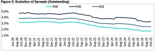 * In October 2025, SCBs’ fresh spread increased by 17 bps, standing at 3.07%, primarily attributed to credit growth with the festive season, portfolio shift towards higher yield segments and banks defending margins amid slower rate-cut transmission. Overall, spreads remained stable, supported by a shift in the loan mix toward segments offering higher returns.