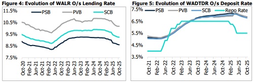 * As of October 2025, SCBs' outstanding lending rate decreased by two bps m-o-m to 9.24%, with PSBs reducing by three bps to 8.60%, while PVBs remained flat at 10.17% as banks passed on the rate cuts but moderated the impact of falling yields by adjusting the loan mix. Meanwhile, the outstanding deposit rates of SCBs decreased by four bps to 6.78%, reflecting repricing of deposit portfolios toward lower market rates, helping ease funding costs and protect margins. PSBs, PVBs, and FBs declined by four, five and one bps, reaching 6.87%, 6.86% and 5.14% respectively.