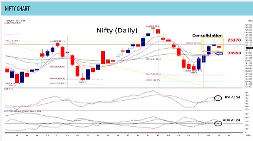 Occurrence of an Inverse Hammer candlestick pattern indicated exhaustion and a hurdle near the 25170 zone. The highlighted confirmatory close below 25040 was the immediate requisite to validate a near-term corrective phase; however, this move occurred with long wicks, suggesting indecision rather than strong bearish conviction. Despite the short-term softness, any pullback towards 24950 should be viewed as a normal corrective move within the consolidation zone. On the downside, a decisive break below 24620 would invalidate the current bullish setup. Until then, any dips should be considered buying opportunities in the absence of a major reversal pattern. Conversely, a close above 25170 would signal the start of a fresh directional momentum phase, potentially propelling the index towards 25400–25500. While global uncertainties and FII outflows continue to pose headwinds, domestic sentiment remains resilient — led by strength in largecap IT and Banking names. Overall, a sustained move above 25170 will confirm a breakout and reinforce the medium-term uptrend, whereas maintaining a buy-on-dips approach above 24890 remains the preferred strategy.