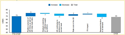 We maintain our estimate for Brent at US$69.0/b for the Calendar Year 2025 (as published on June 13, 2025) compared to YTD average of US$69.7/b.