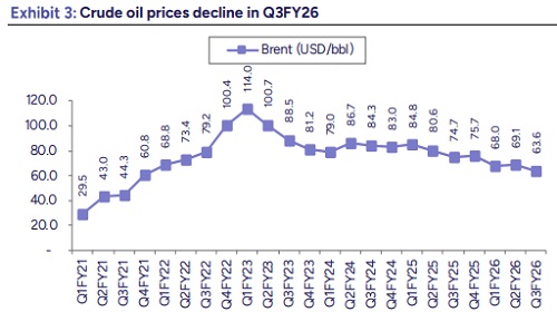 * Crude oil prices weakened: Crude oil prices continued its downward trajectory in Q3FY26, averaging USD63.6/bbl in Q3FY26 (vs USD69.0/bbl in Q2FY26), with prices briefly dipping below USD60/bbl during the quarter reflecting persistent bearish sentiment amid oversupply and muted demand growth. Escalating geopolitical tensions including continued Ukrainian drone attacks on Russian infrastructure, US sanctions on Russian oil imports, and US seizing Venezuelan tankers failed to provide sustained upside support to crude prices.