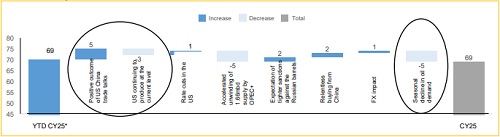 As highlighted in Exhibit 1, the positive outcome of US China trade talks would have supported average Brent prices for Calendar Year 2025 by the quantum of US$5/barrel(b). Although, there is possibility of trade negotiations till Nov 1, 2025, wherein a neutral to positive outcome could support Brent prices. However, in case of negative outcome, we see US oil production decreasing by 5%, accounting for about 1% of global oil supply, as the oil prices would sink below US$60/b. This would in turn provide balance to the oil markets.