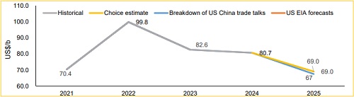 Source: FactSet for Historical data, Choice Institutional Equities, Note: US EIA estimate now align with the Choice estimate of US$69/b for CY25
