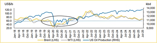 Overall, we maintain our estimate for Brent at US$69.0/b for the Calendar Year 2025 (as published on June 13, 2025) compared to YTD average of US$69.5/b. We have marked to market our estimates as a standard industry practice, exercised on quarterly basis. With the catalyst of US–China trade talks delayed longer than expected, and following a mark-to-market exercise, we have revised our Brent estimate under the ‘Breakdown of US–China Trade Talks’ scenario to US$67/b for Calendar Year 2025, compared with US$62/b published on June 13, 2025.