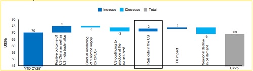 As highlighted in earlier publications including the report on Sept 11, 2025, the rate cuts by the US could drive the demand and lead to certain upside for oil price. We have baked in this increase in our CY25 estimate of US$69/b.