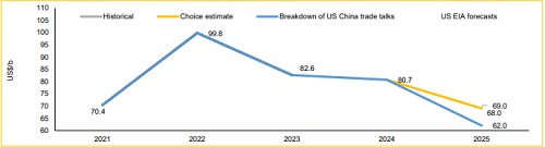 Given the ongoing developments -- particularly the possibility of US tariff impositions and subsequent renegotiations - we anticipate some market volatility. Nonetheless, Brent crude is likely to remain range-bound between US $60 and $75/b in absence any geopolitical escalation. Below US$60/b, marginal US supply becomes uneconomical, while above US$75/b, demand elasticity is expected to increasingly moderate prices in the current macroeconomic climate.
