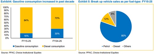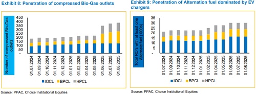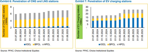 As gasoline to diesel consumption has increased significantly increase over the past decade, it still remains considerably lower as shown in Exhibit 4. However, the devil lies in the details wherein the sale of petrol vehicles over the past decade accounting for 80% of total. As a result, the number of individual consumers impacted on the back of above is higher. Moreover, we also highlight the impact of adoption of alternate fuels on OMCs. In our view, considering the number of Electric vehicles sold, the pace of infrastructure is lagging and disincentivize overall consumers. In our view, the impact of EV penetration on OMCs at the current rate remains minimal. However, PSUs are adopting to changing consumer trends as highlighted in Exhibit 6 to 9.