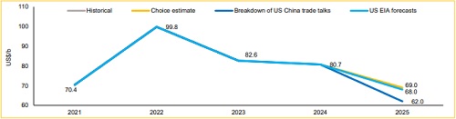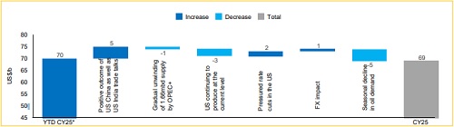 We maintain our estimate for Brent at US$69.0/b for the Calendar Year 2026 (as published on June 13, 2025) compared to YTD average of US$69.9/b.