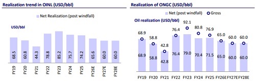 ? Upstream players - earnings leveraged to crude upside: Upstream companies could benefit from higher crude prices. There is currently no windfall tax in place, and Brent is already trading close to USD75/bbl. While we have a Neutral rating on both ONGC and Oil India, note that a USD5/bbl change in oil prices impacts FY27 standalone EBITDA by ~8% for ONGC and ~11% for Oil India.