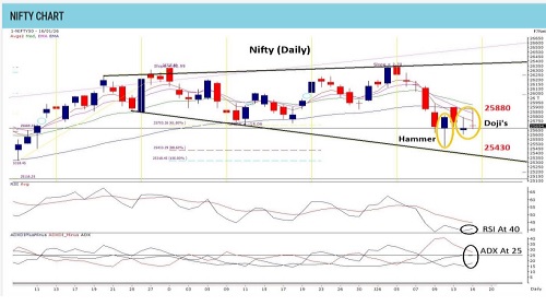 Last week’s recovery from the 25430-support unfolded in the form of a bullish Hammer on the daily chart, while the weekly candle evolved into a Spinning Top, highlighting indecision. However, both formations indicate exhaustion of the corrective phase within the broader oscillating band of 25880–25430.The bullish hammer was followed by another reversal pattern resembling an Inverse Hammer in subsequent sessions, with a key overhead resistance placed at 25880, coinciding with the 50 DEMA. That said, these bullish signals will gain technical validity only if the index decisively breaches and sustains above 25880 on a closing basis. Options data reflects a range shift towards 25500–26000, with a mild bias suggesting strong support emerging near the 25500 zone for the current weekly series. Within this setup, the index may witness a sharp swing on either side of the 25880–25500 band during the week. A decisive close above 25880 would signal a revival in trend strength and could open the door for an upside move towards and beyond the 26130 zone. Conversely, failure to reclaim 25880 may keep the index trapped in a volatile, range-bound phase.
