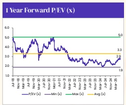 HDFC Life’s consistent execution, strong brand franchise, and industry-leading profitability metrics justify its premium valuation. The long-term outlook remains robust, driven by its strategic expansion into underpenetrated Tier 2/3 markets, a growing protection business, and a relentless focus on digital innovation. We expect an Embedded Value (EV) CAGR of over 17% through FY27, reflecting sustained value creation. While near-term margin pressures are largely priced in, the company’s resilient business model and clear growth drivers support continued upside. We value the stock at 2.6x its FY27E EV, maintaining a positive outlook with a target price of Rs. 870.