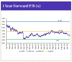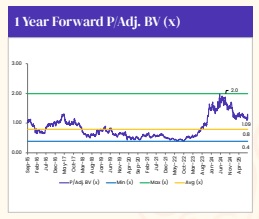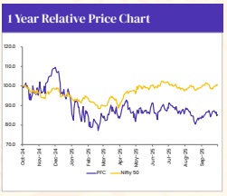 PFC’s outlook remains strong, driven by its strategic role in financing India’s energy transition and infrastructure growth. The company is set to capitalize on a healthy disbursement pipeline, stable profitability, and resilient asset quality, which are projected to deliver a PAT CAGR of 12.3% over FY25-27E. We value PFC on a standalone basis at 0.9x its FY27E Adjusted Book Value and add the value of its stake in REC (with a 30% holding company discount). This methodology supports continued upside, and we maintain a positive outlook with a target price of ?502.