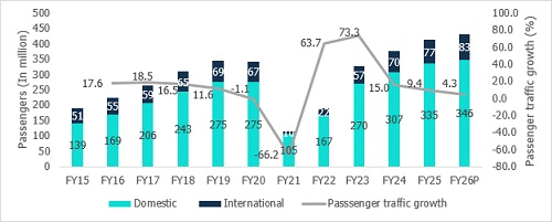 According to CareEdge Ratings, it anticipates passenger traffic to reach ~ 430 million passengers in FY26, revised from its earlier estimate of 445 million passengers. This translates to revised passenger traffic growth projections of 4.3% for FY26, from the earlier expected 8%, marking the lowest growth rate of the decade (excluding the COVID-19 period).