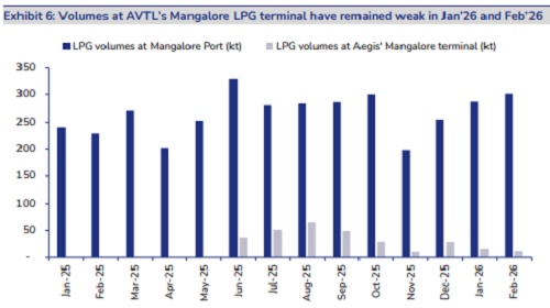 * Mangalore LPG volumes remain weak: AVTL’s 3QFY26 gas segment EBIT was adversely impacted by low utilisation and start-up costs in Mangalore. LPG volumes at the Mangalore terminal remained weak in Jan’26 and Feb’26 with average monthly run rate lower than that in 3QFY26 as well.
