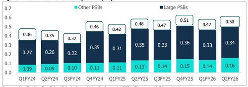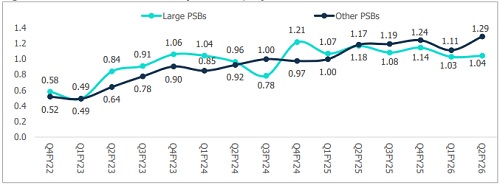 * RoA for Large PSBs declined by 13 bps on a y-o-y basis at 1.04% in Q2FY26, primarily due to margin compression from higher deposit costs and lower spreads. In contrast, RoA for Other PSBs increased by 12 bps y-o-y to reach 1.29%, mainly attributed to growth in fee-based income. Sequentially, Other PSBs witnessed an uptick of 26 bps, attributed to slightly improved margins in the current quarter, driven by changes in the portfolio mix and lower provisions.