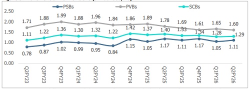 * RoA of SCBs declined by 11 bps y-o-y to 1.29% in Q2FY26, as the pace of asset growth surpassed profit growth amid margin compression. In contrast, sequentially, it witnessed a marginal one bp uptick, driven by PSBs. Meanwhile, these gains in PSB profitability have cushioned the impact of moderating PVB returns, resulting in steadier system-wide RoA.